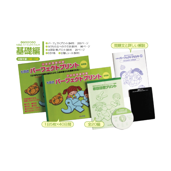 小学校受験対策七田式 パーフェクトプリント基礎編 価格: 7,500円 レビュー評価: 5.0 レビュー数:1 1日5枚のプリント学習で、思考、知識、数量、言語、図形構成、巧緻性などが身につきます!七田式パーフェクトプリントは、数の概念や言語、お話記憶など、就学前に身につけておきたい基礎学力を学ぶのに最適な教材です。旧商品名:「40日間でバッチリ!パーフェクトプリント」小学校受験問題集(1)(2)(3) の改訂リニューアル版となります。■カリキュラム有名小学校入試の出題傾向分析、オリジナル問題も合わせた6ジャンル。『思考』『知識』『言語』『数量』『図形構成・巧緻性』『お話記憶(別冊)』■内容/使い方実際の入試の方式に合わせ、子どもが取り組むプリントは、解答欄のみのシンプルな仕様です。別冊の手引きに問題文 Supported by 楽天ウェブサービス |